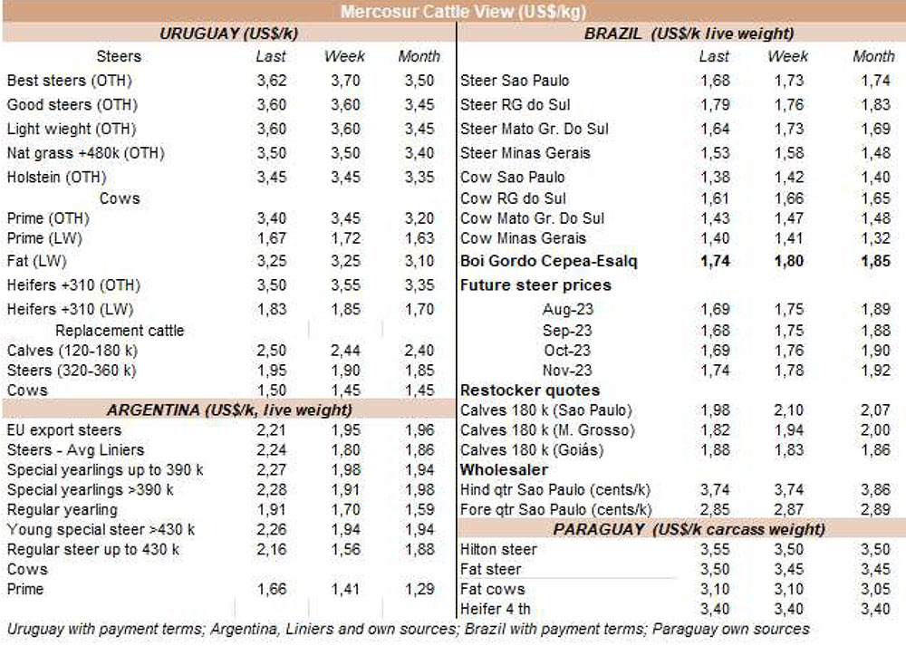 阿根廷出口公牛的價格本周爆炸式增長了50美分至每公斤酮體4.30美元(包括9%的出口稅)。而巴西恰恰相反,那里的包裝公司被收購以此壓低價格。出口州的平均每公斤損失9美分至每公斤3.02美元,成為該地區(qū)的最低價格參考值。烏拉圭的牛的價格也面臨下行壓力,主要是質(zhì)量最重、最好的公牛,價格為3.60美元左右。在巴拉圭,良好的飼料條件要求牛肉維持3.50美元左右的市場價格。
